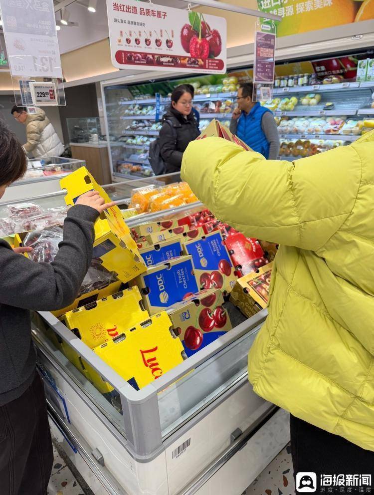 12月10日晚间,在济南某盒马鲜生门店,记者看到有不少消费者正在车厘子区域挑选车厘子,5斤装的双J车厘子售价229元,3J为249元,相较于前段时间250元至260元的价格区间,降幅接近10%。“现在买太划算了,周末看还是258元一箱,这周就降了20多元,果断买一箱。”正在选购的市民李女士展示着购物车,她告诉记者,今年车厘子价格亲民,家里消费频次明显增加。