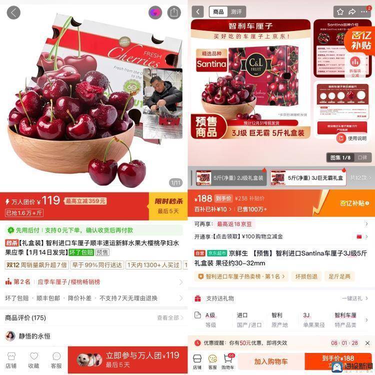 电商平台,车厘子价格更低,拼多多平台,双J5斤车厘子礼盒装预售款售价低至139元;京东平台,3J5斤预售款礼盒装售价低至188元。