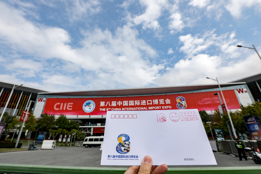 第八届进博会今天开幕。上午8点刚过,距离国家会展中心(上海)“四叶草”最近的徐泾邮政支局已排起长队,邮迷们神情热切。原来,上海市邮政分公司特为本届进博会启用并发行了《第八届中国国际进口博览会》YFM118E型邮资机戳和纪念封各1枚。